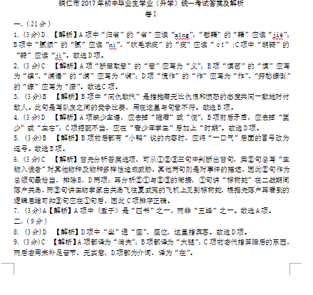 贵州省铜仁市2017年中考语文试题答案(图片版)
