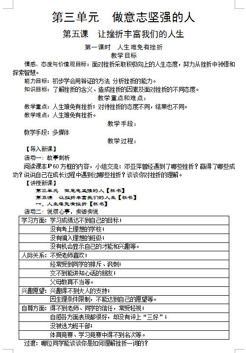 人教版七年级下政治第五课让挫折丰富我们的人生(下载版) 2018-02-17 13:57:01中考网编辑 点击免费领取中考核心考点资料! 人教版七年级下政治第五课让挫折丰富我们的人生(下载版)如下: 请下载附件: 《人教版七年级下政治第五课让挫折丰富我们的人生(下载版)》 (本地下载在线阅读)