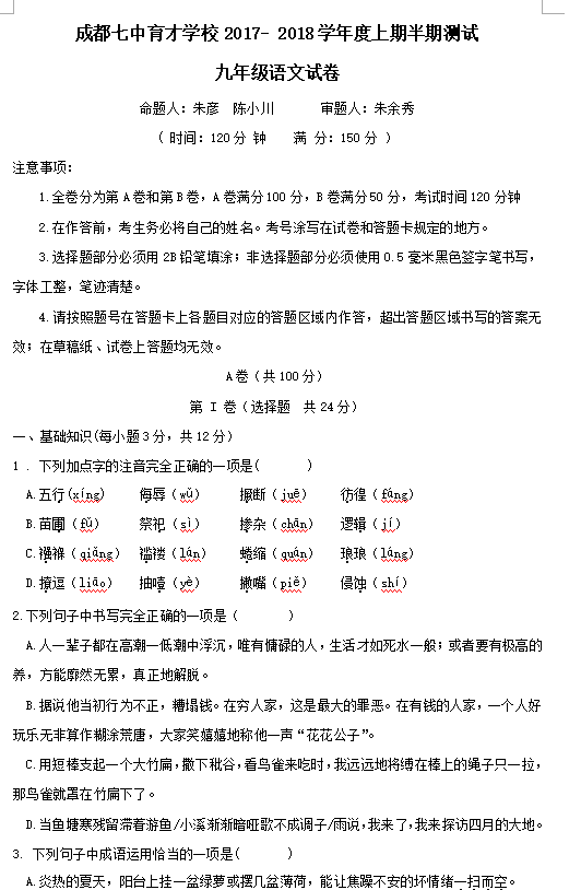 四川省成都七中育才学校2018届九年级上学期半期考试语文试卷(图片版)