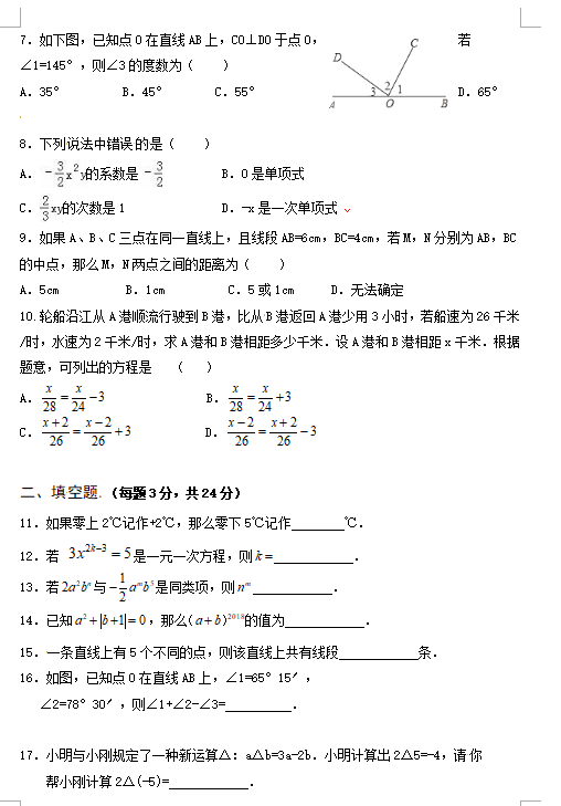甘肃白银育才2017-2018七年级上期末数学试题(图片版)(2)