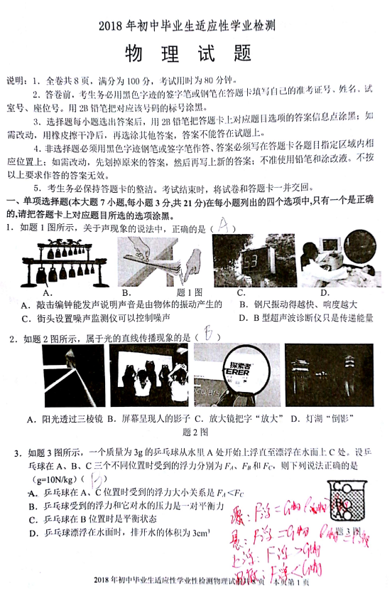 2018年广东佛山桂城初三下二模物理试题(图片版)