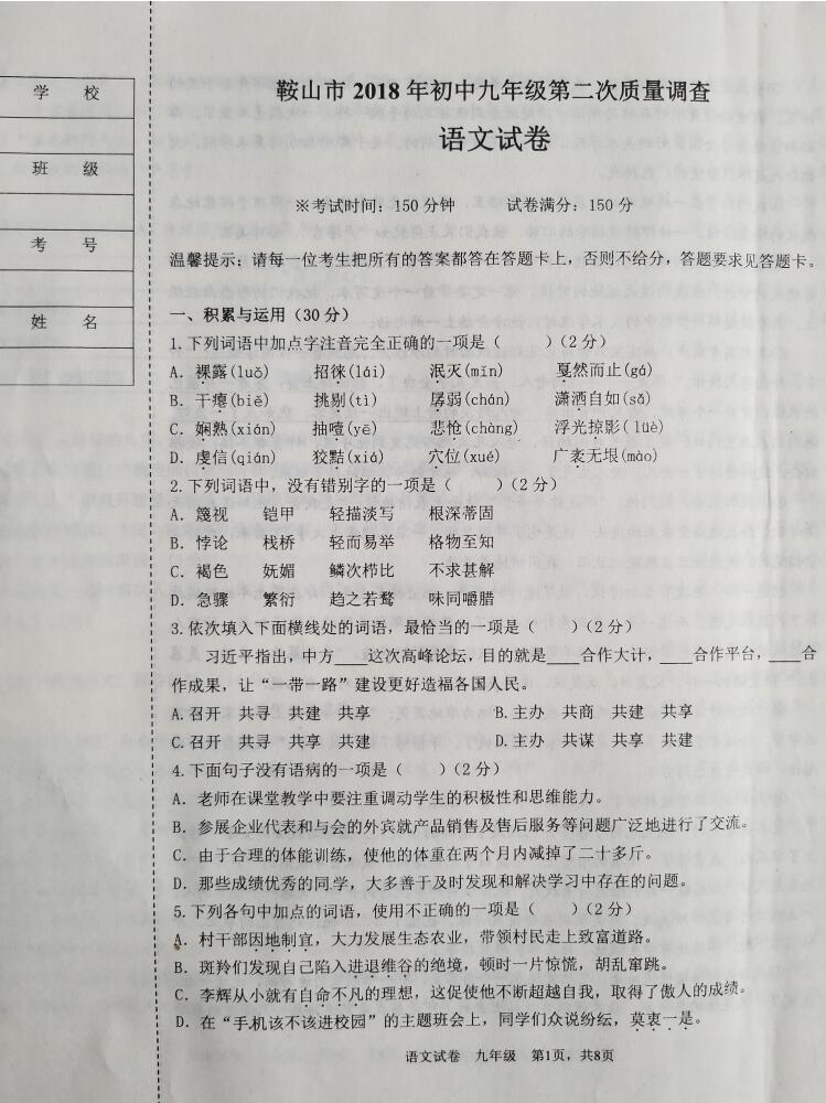 2018辽宁鞍山九年级第二次质量调查语文试题(下载版) 2018-08-11 11:02:30中考网编辑 点击免费领取中考核心考点资料! 2018辽宁鞍山九年级第二次质量调查语文试题(下载版)如下: 请下载附件: 《2018辽宁鞍山九年级第二次质量调查语文试题(下载版)》 (本地下载在线阅读)