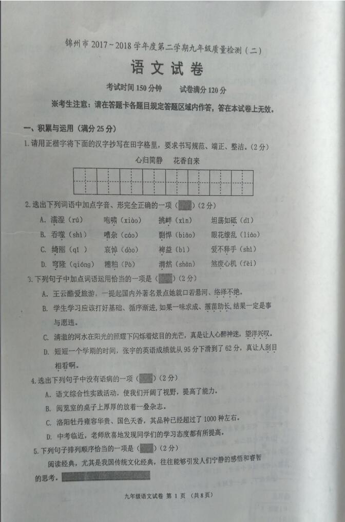 2018辽宁锦州市九年级语文质量检测(二)(下载版) 2018-08-11 11:19:12中考网编辑 点击免费领取中考核心考点资料! 2018辽宁锦州市九年级语文质量检测(二)(下载版)如下: 请下载附件: 《2018辽宁锦州市九年级语文质量检测(二)(下载版)》 (本地下载在线阅读)