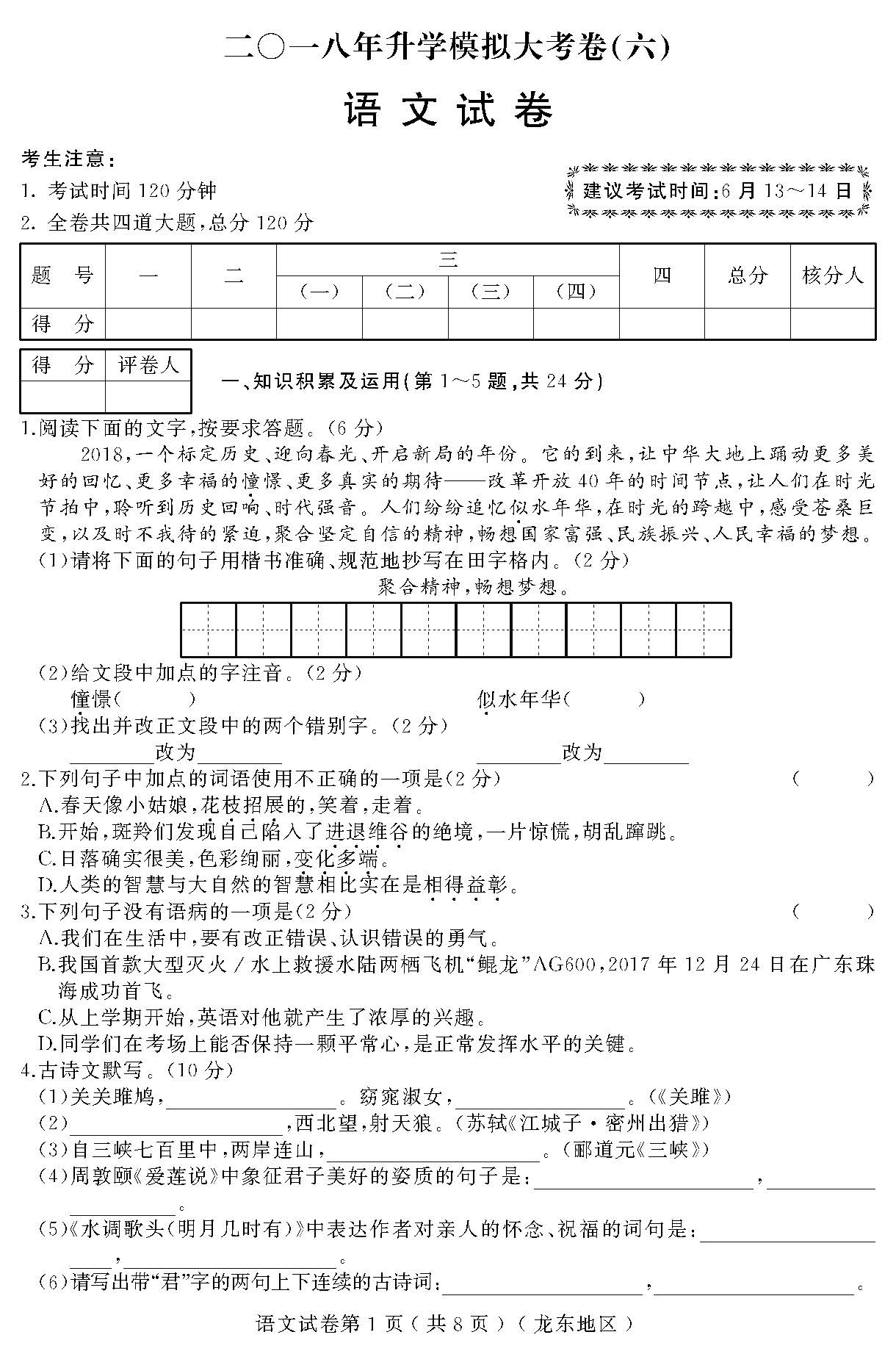2018黑龙江龙东地区升学模拟大考卷(六)语文试题(下载版)