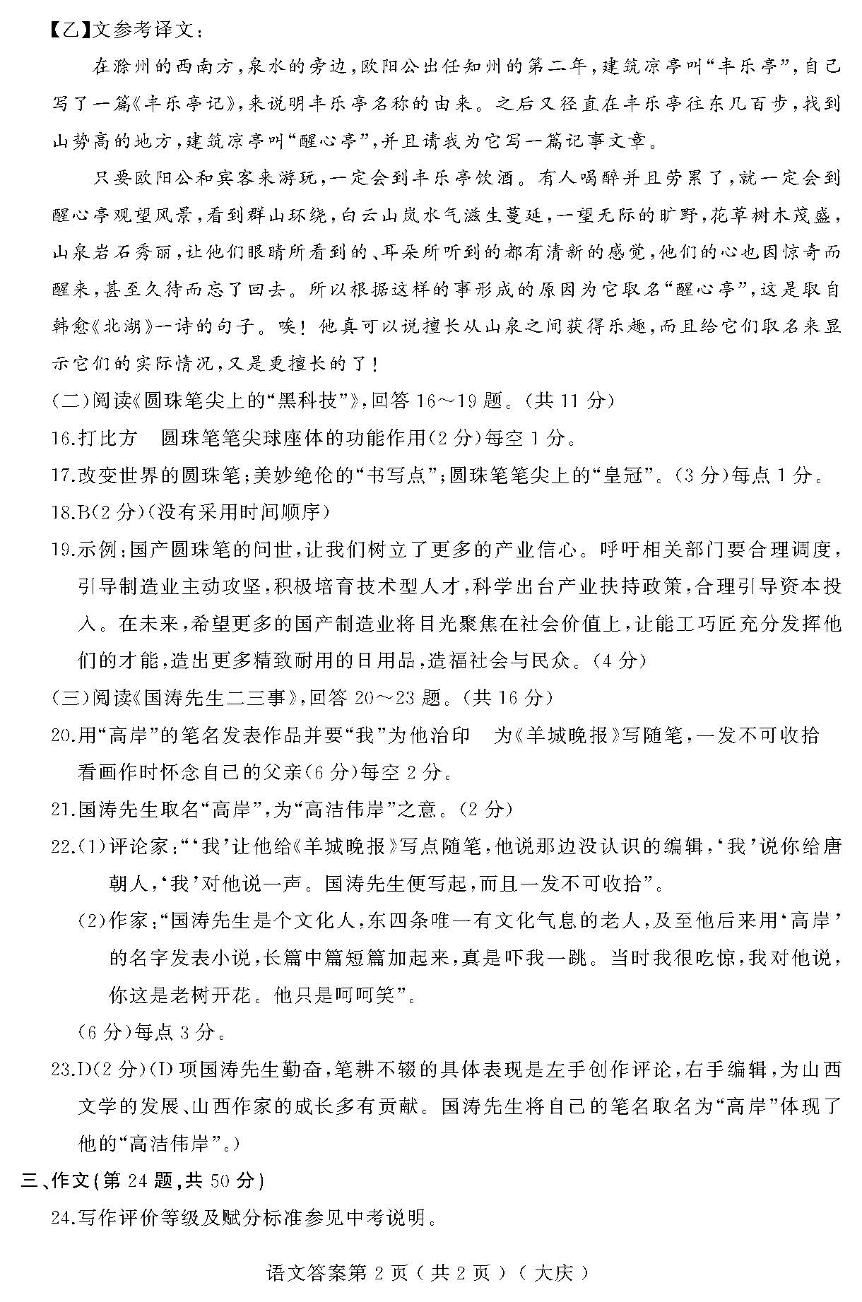 2018黑龙江大庆升学模拟大考卷(三)语文试题答案(图片版)(2)