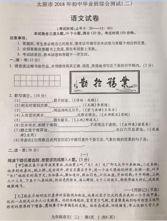 2018山西太原九年级二模语文试题(图片版)如下: