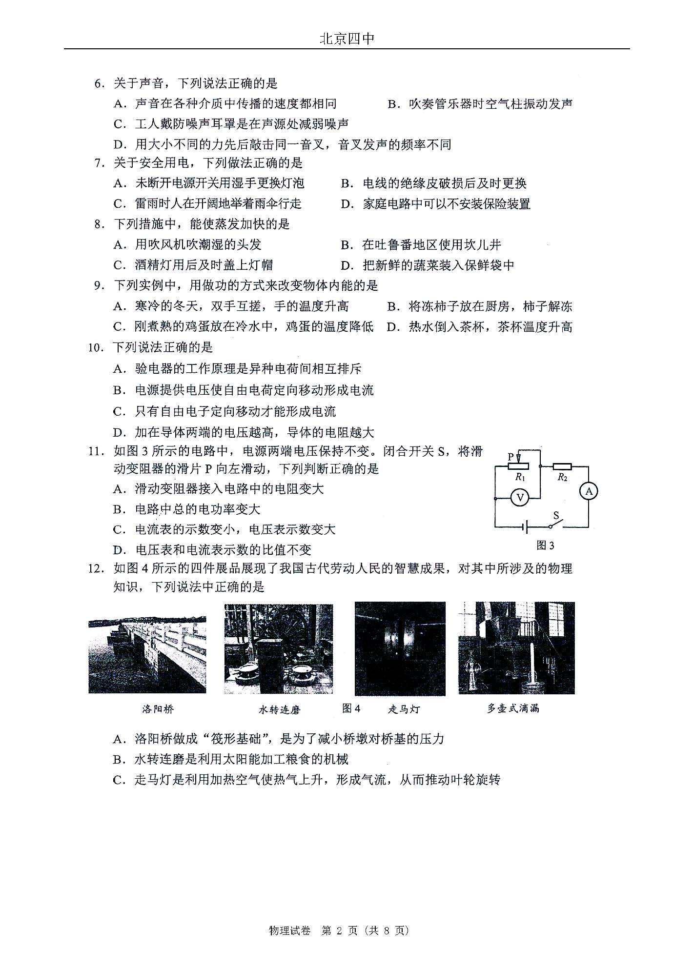 2018北京四中考前物理模拟试卷(图片版)(2)