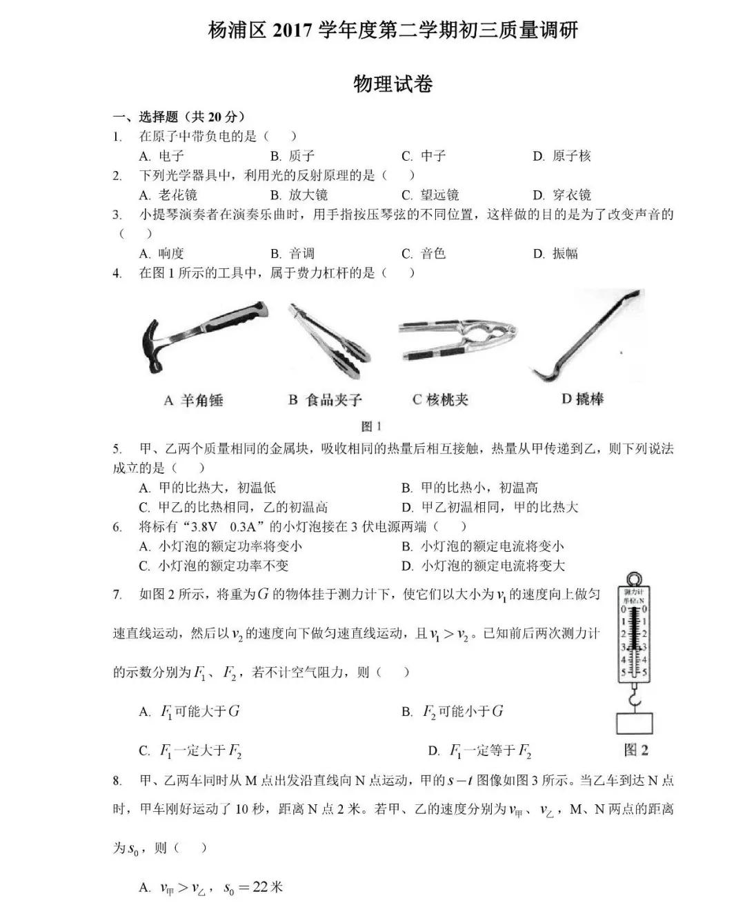 2018上海杨浦九年级二模物理试题(图片版)如下: