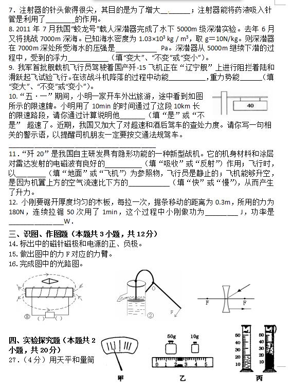 2018重庆南开中学九年级下物理中考模拟测试卷(图片版)(2)