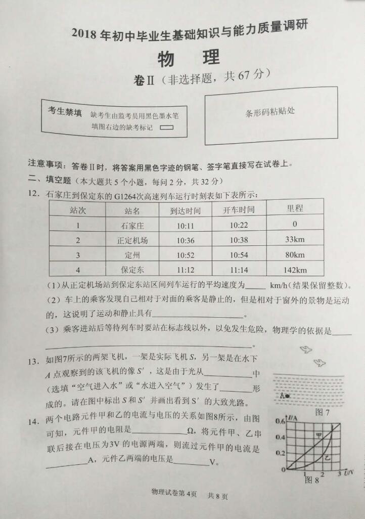 2018河北石家庄桥西中考物理模拟试卷(图片版)(4)
