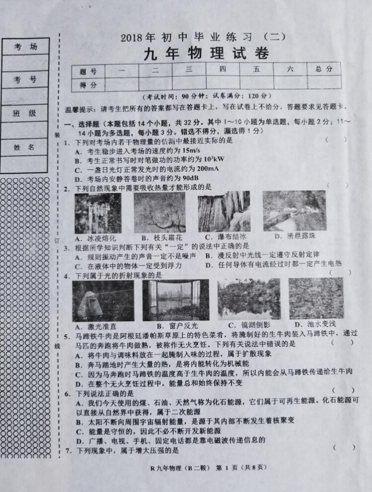 2018辽宁本溪初中毕业练习(二)物理试卷(图片版)