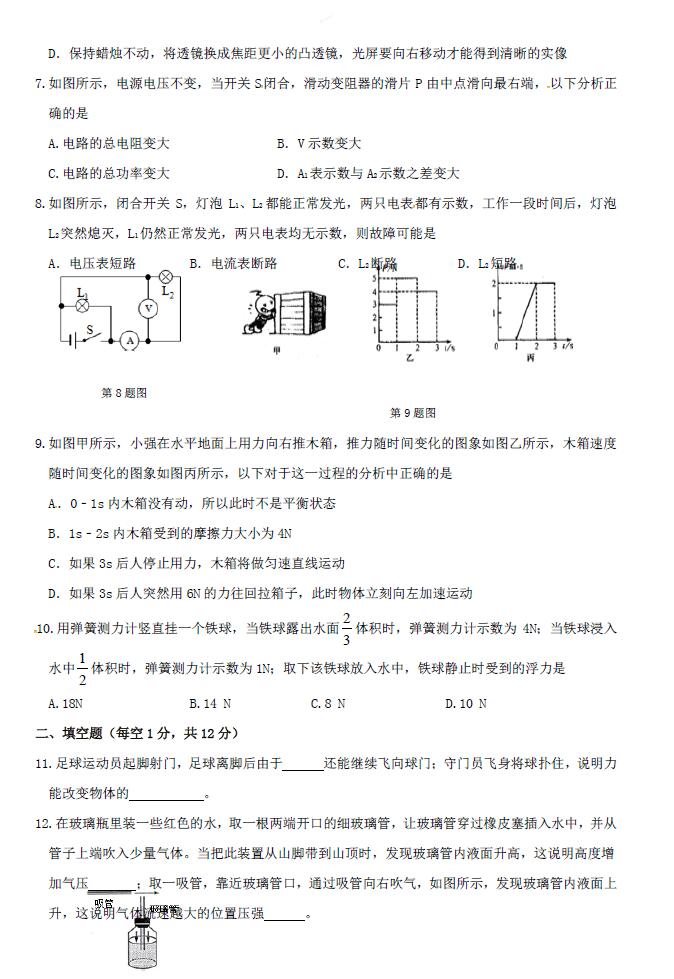 2018吉林实验中学九年级二模物理试题(图片版)(2)