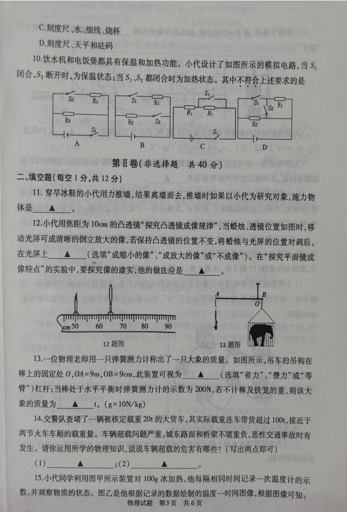 2018山东济宁鱼台九年级二模物理试题(图片版)(3)