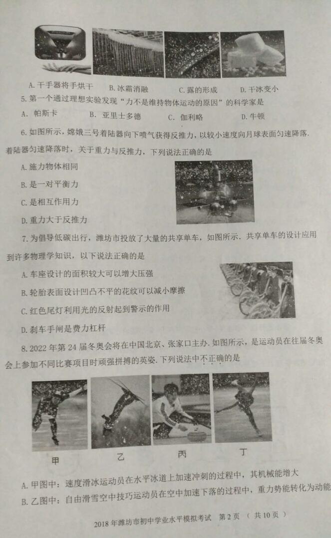 2018山东潍坊初中学业水平物理模拟考试(二)(图片版)(2)