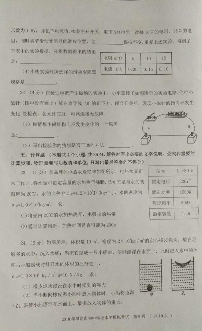 2018山东潍坊初中学业水平物理模拟考试(二)(图片版)(5)