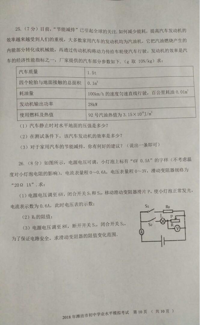 2018山东潍坊初中学业水平物理模拟考试(二)(图片版)(6)