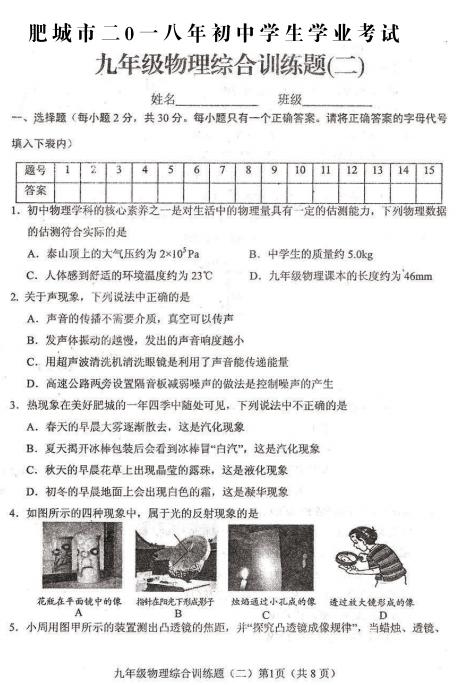 2018山东肥城中考模拟考试(二)物理试题(图片版)如下: