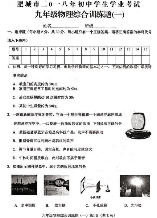 2018山东肥城中考模拟考试(一)物理试题(图片版)如下: