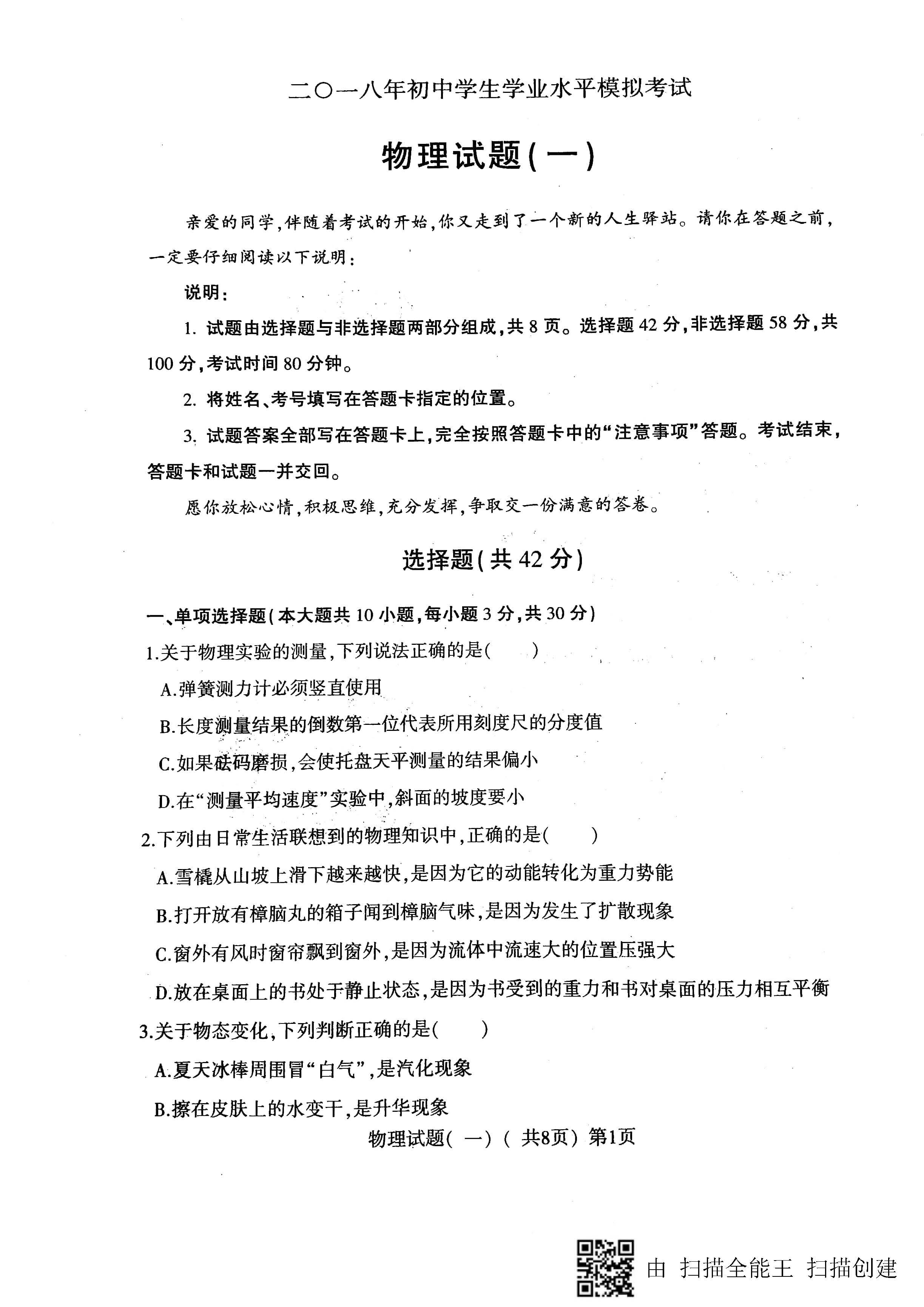 2018山东阳谷九年级一模物理试题(图片版)如下: