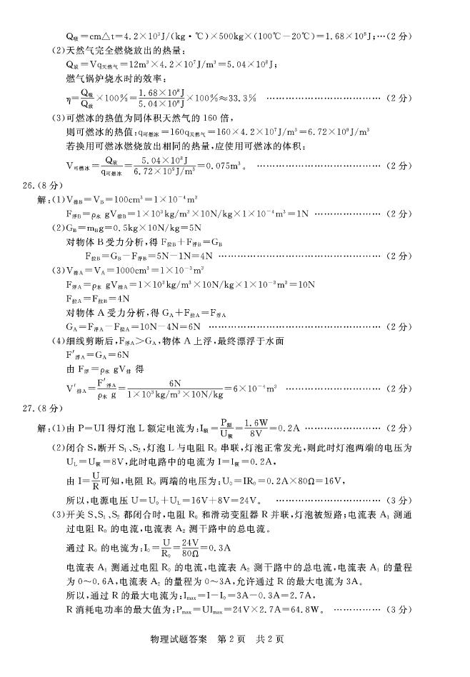 2018山东聊城九年级一模考试物理试题答案(图片版)(2)