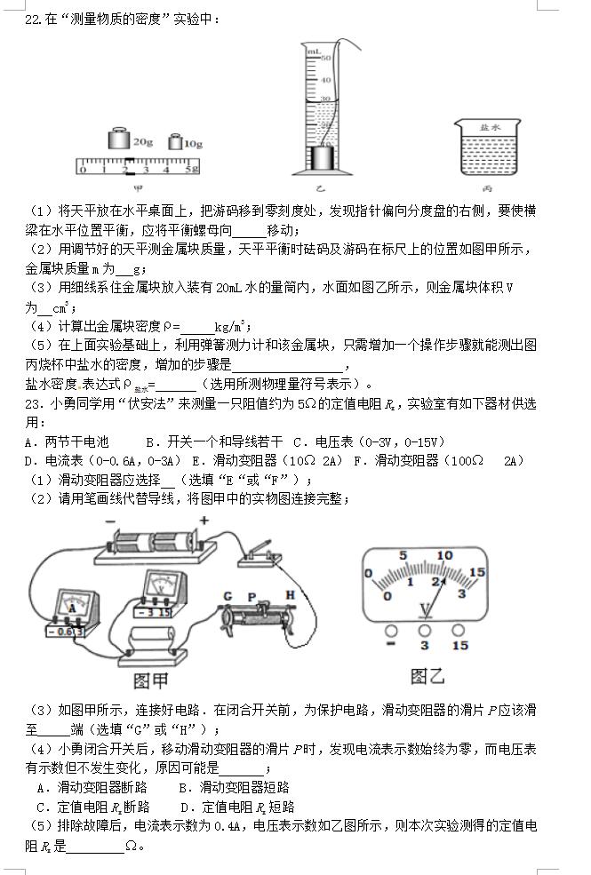2018山东泰安岱岳新城实验中学中考物理模拟试题(图片版)(5)