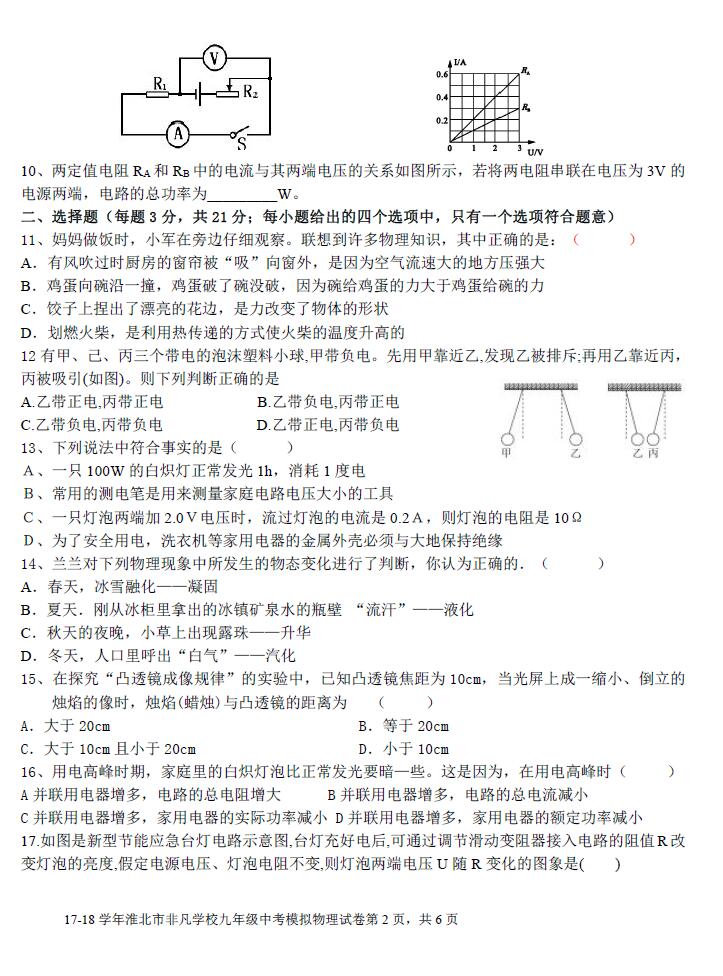 2018安徽淮北非凡学校中考模拟物理试卷(图片版)(2)
