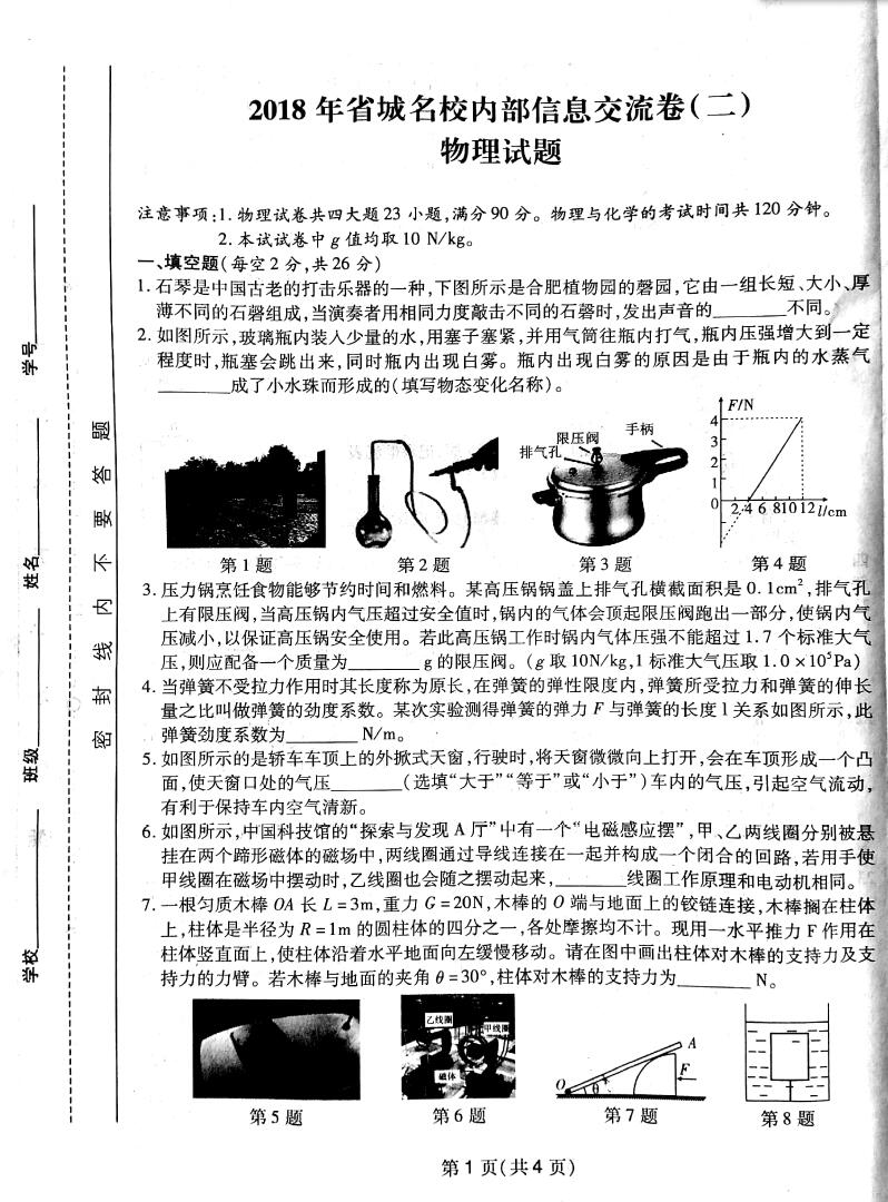 2018安徽省城名校内部信息物理交流卷(二)(图片版)如下: