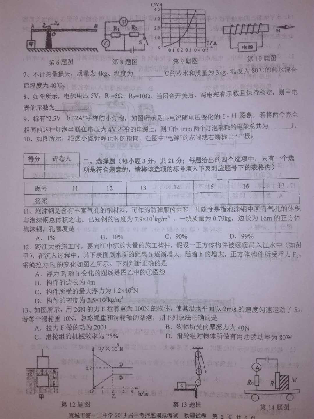 2018安徽宣城十二中中考物理押题卷(图片版)(2)