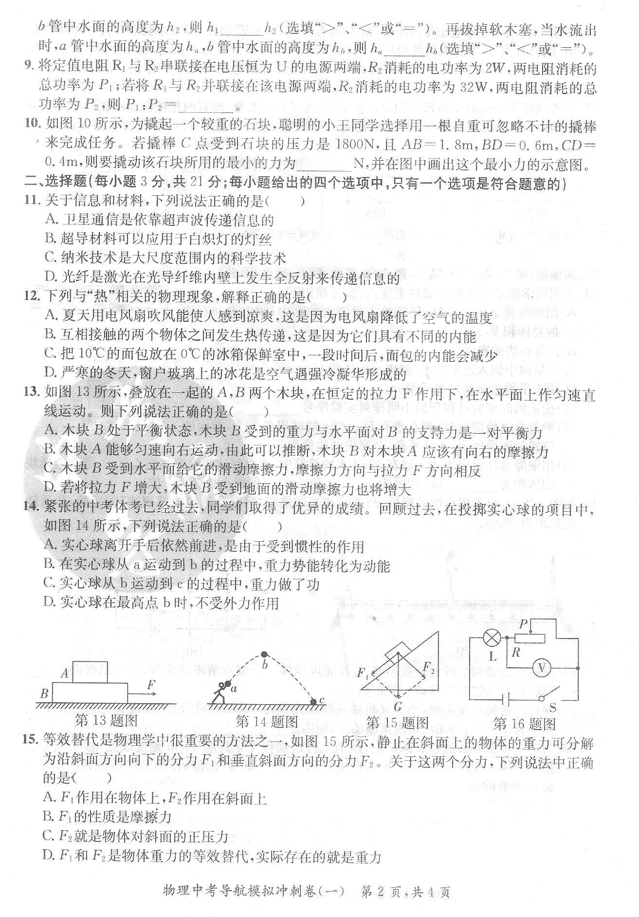 2018安徽省中考导航模拟冲刺物理试题(一)(图片版)(2)