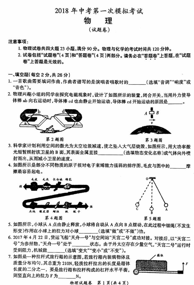 2018安徽明光中考一模物理试题(图片版)如下: