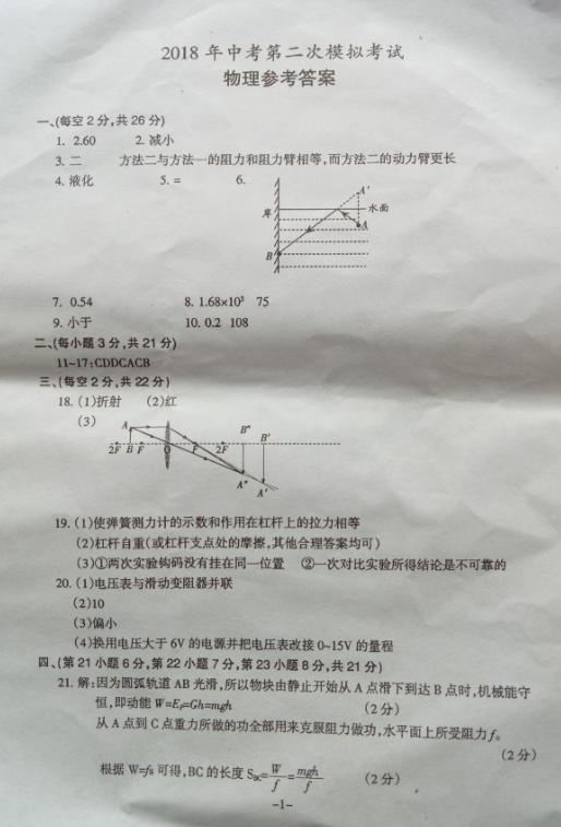 2018安徽定远七里塘中学九年级下二模物理试题答案(下载版)如下: