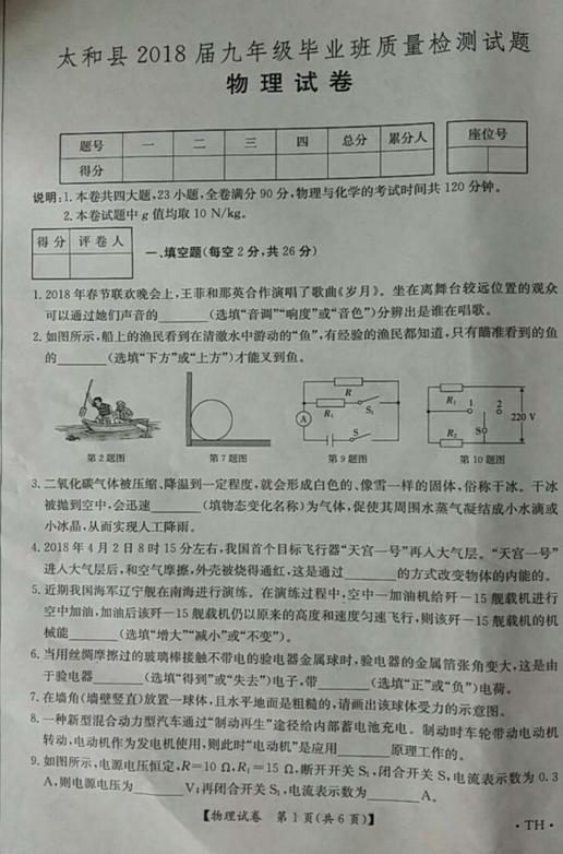 2018安徽阜阳太和九年级下物理试题(图片版)如下: