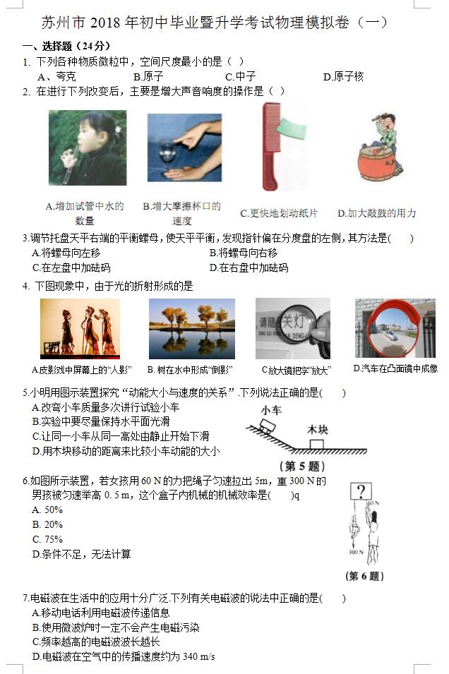 2018江苏苏州初中毕业暨升学考试物理模拟卷(一)(下载版)如下: