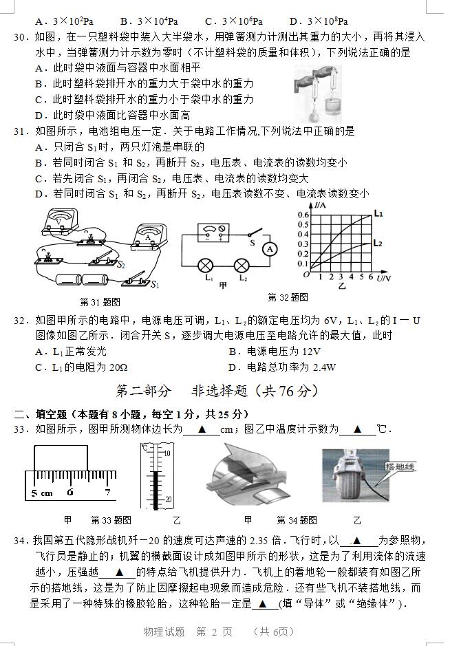 2018江苏泰兴西城初中三模物理试卷(图片版)(2)