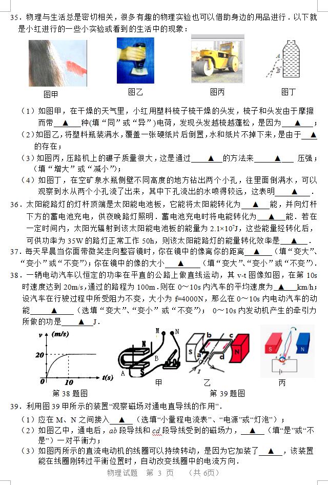 2018江苏泰兴西城初中三模物理试卷(图片版)(3)