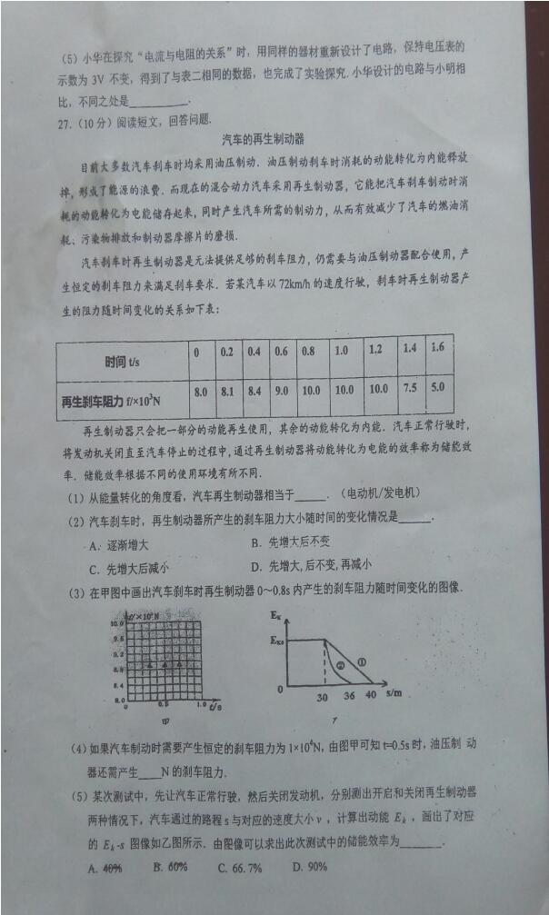 2018江苏盐城滨海第一中学九年级物理模拟试卷(图片版)(6)