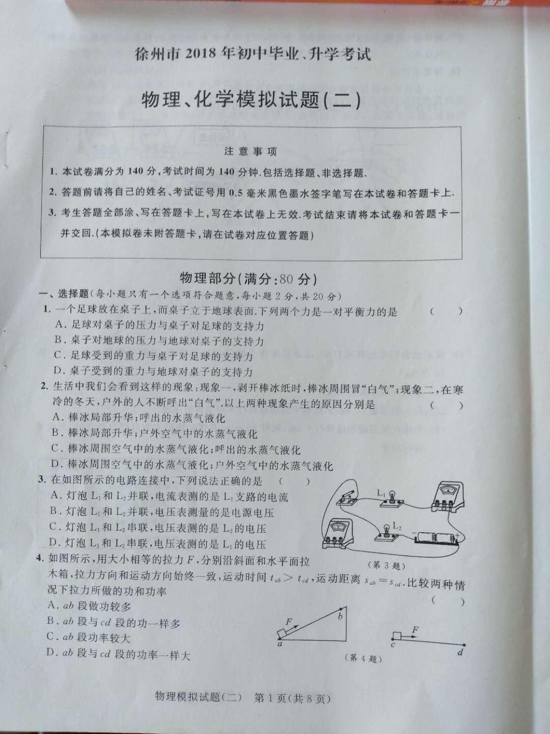 2018江苏徐州中考物理模拟试题(二)(图片版)如下:
