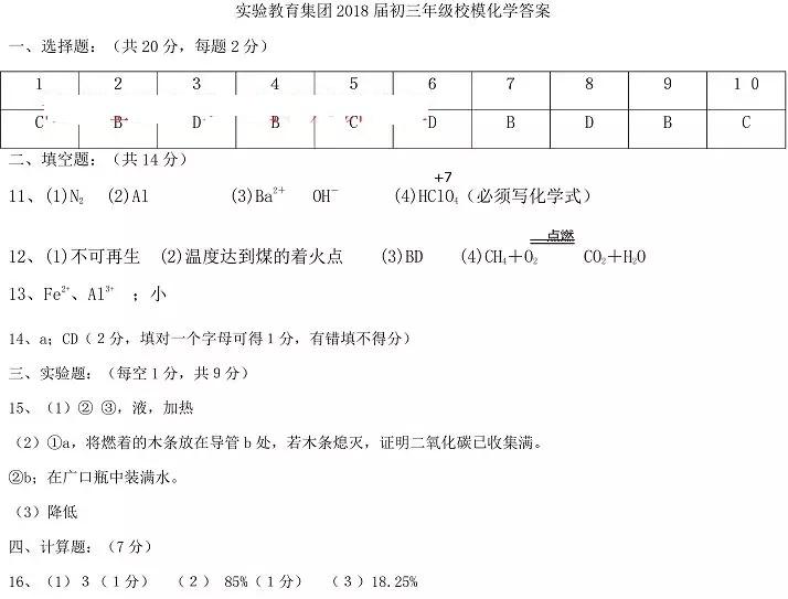 2018内蒙古呼和浩特实验中学九年级校模化学试题答案(下载版)