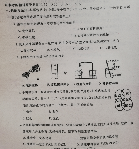 2019山东菏泽曹九化学一模试题(word版)