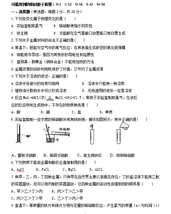 宁夏银川24中2019九下一模考试化学题(word版)