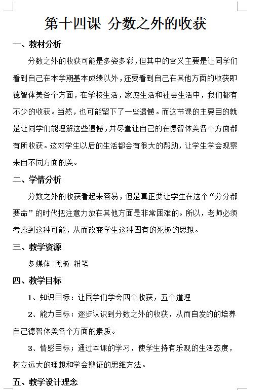教科七上思品第十四课《分数之外的收获》教案(下载版) 2022-03-08 18:00:39佚名 点击免费领取中考核心考点资料! 教科七上思品第十四课《分数之外的收获》教案(下载版) 请下载附件: 《教科七上思品第十四课《分数之外的收获》教案(下载版)》 (本地下载在线阅读)