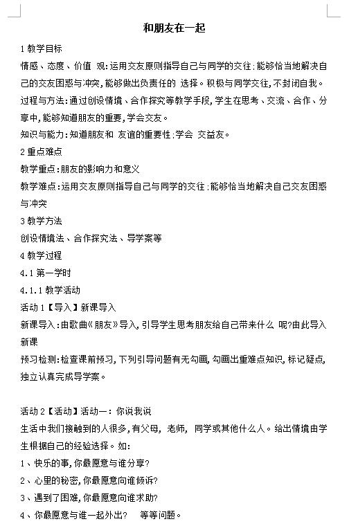 人教版七上道德与法治4.1和朋友在一起教案(下载版) 2022-03-08 22:04:42佚名 点击免费领取中考核心考点资料! 人教版七上道德与法治4.1和朋友在一起教案(下载版) 请下载附件: 《人教版七上道德与法治4.1和朋友在一起教案(下载版)》 (本地下载在线阅读)