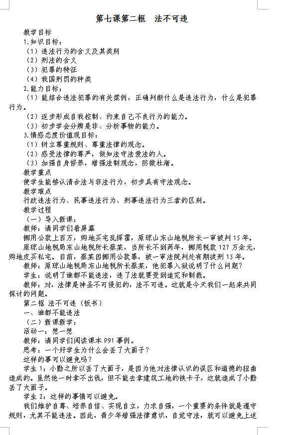 关于【人教版七下思想品德第七课第二框法不可违教案(图片版)】及中考、查分、择校等最新干货资讯,均在家长帮App,还有配套习题及老师免费解答问题,赶快戳我下载 >>>【家长帮App】<<< 相关推荐 2020年中考必备APP「家长帮」免费下载2020年全国中考考试时间汇总2020年全国中考报名时间汇总2020年全国中考大事记2020年中考考前冲刺各科备考全攻略历年全国各省市中考真题及答案历年中考满分作文历年中考录取分数线汇总2020年中考资讯提前看2020年中考政策解读2020年中考政策解读 点击查看更多