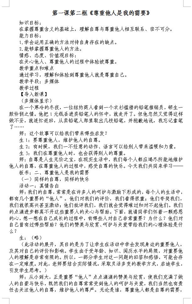 人教版七下思想品德第一课第二框尊重他人是我的需要(下载版) 2022-03-09 09:33:06佚名 点击免费领取中考核心考点资料! 人教版七下思想品德第一课第二框尊重他人是我的需要(下载版) 请下载附件: 《人教版七下思想品德第一课第二框尊重他人是我的需要(下载版)》 (本地下载在线阅读)