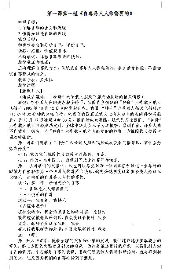 人教版七下思想品德第一课第一框自尊是人人都需要的(图片版)