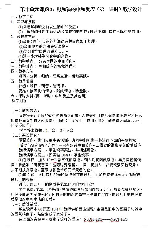 人教版九下化学第十单元酸和碱的中和反应第一课时教案(图片版)