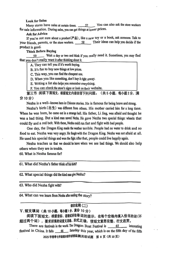 2024-2025学年福建泉州永春县七年级下学期英语期末真题(图片版)(8)