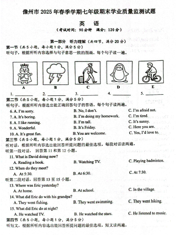 2024-2025学年海南儋州市七年级下学期英语期末真题(图片版)