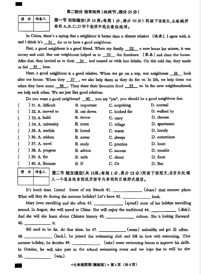 2024-2025学年河北邯郸南新区七年级下学期英语期末真题(图片版)(3)