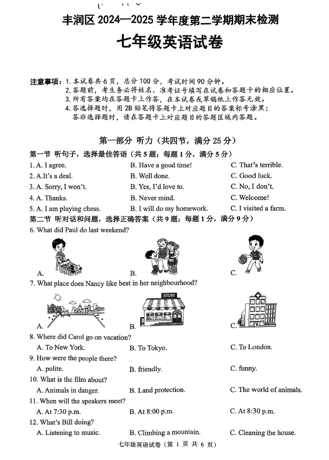 2024-2025学年河北唐山丰润区七年级下学期英语期末真题(图片版)